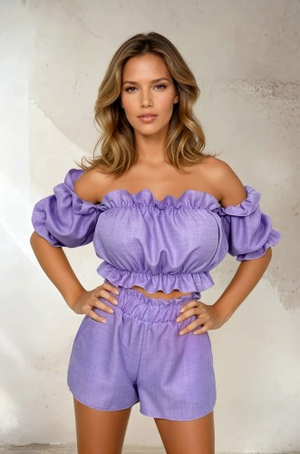 Lekki i wygodny komplet o strukturze lnu jest idealny na lato. Krótki top typu hiszpanka pięknie podkreśla ramiona i szyję. Szorty z miękką, nie uciskającą gumką w pasie zapewniają komfort noszenia. Całość wykonana z przewiewnego materiału, który świetnie sprawdza się w ciepłe dni.