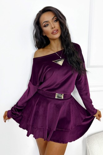 Welurowy komplet ze spódnico-spodenkami to mega dziewczęca propozycja na jesienną stylizację. Mini spódniczka z falbanką i bluzka o luźnym kroju to duet idealny. Komplet bluzka i spódnica noś w wersji sportowej lub eleganckiej.