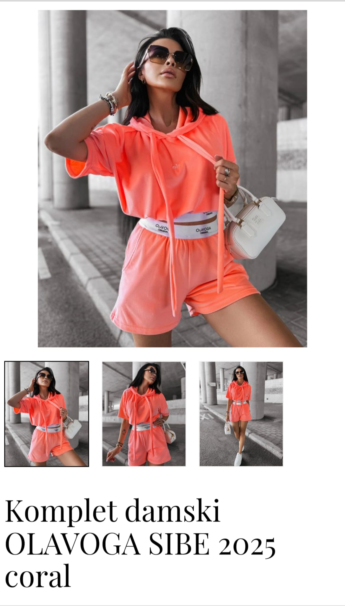 Sportowy komplet damski wykonany z miękkiego w dotyku weluru. Góra – bluza z kapturem z krótkim rękawem. Logowana guma w talii. Kaptur regulowany poprzez sznurek. Na przodzie haft OLV. Dół – szorty z logowana guma w talii. Po bokach kieszenie.