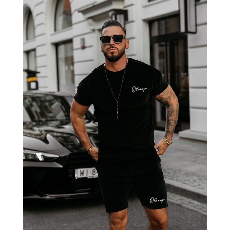 Casualowy komplet męski, wykonany z wysokiej jakości miękkiego w dotyku weluru. Góra – bluzka z krótkim rękawem. Posiada liczne przeszycia. Na przodzie pisany, minimalistyczny haft z logo marki OLAVOGA. Na tyle haft OLV. Dół – spodenki męskie. Talia regulowana poprzez sznurek. Po bokach kieszenie. Na przodzie haft z logo brandu.